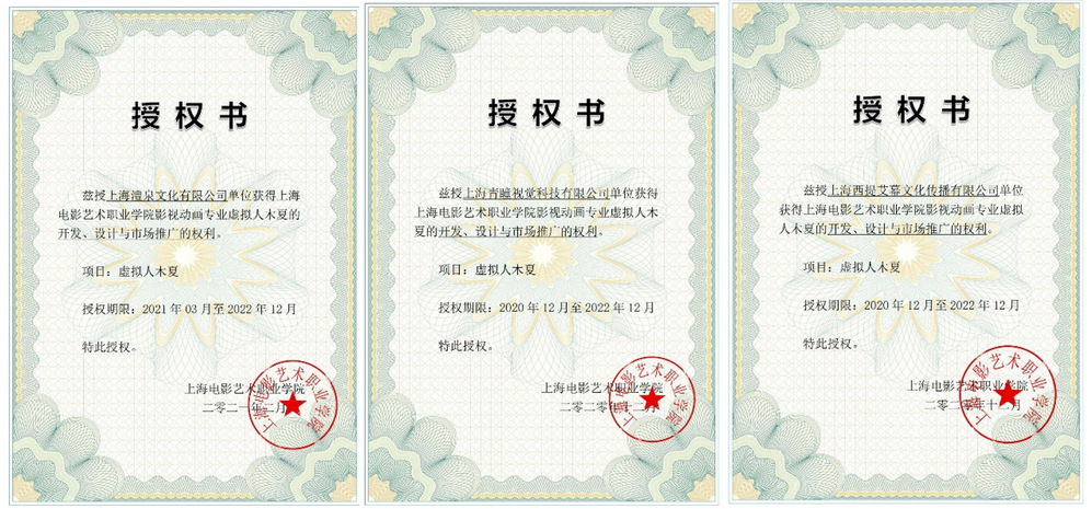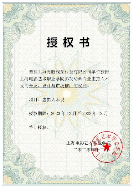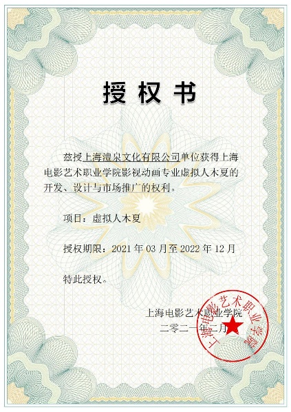 虚拟人“木夏”授权给多家企业开发使用的授权书