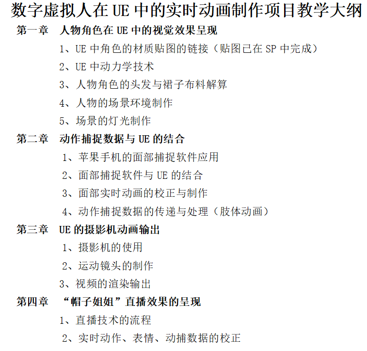 与上海澧泉文化传媒公司联合制定的数字虚拟人在引擎中的实时动画项目教学大纲节选