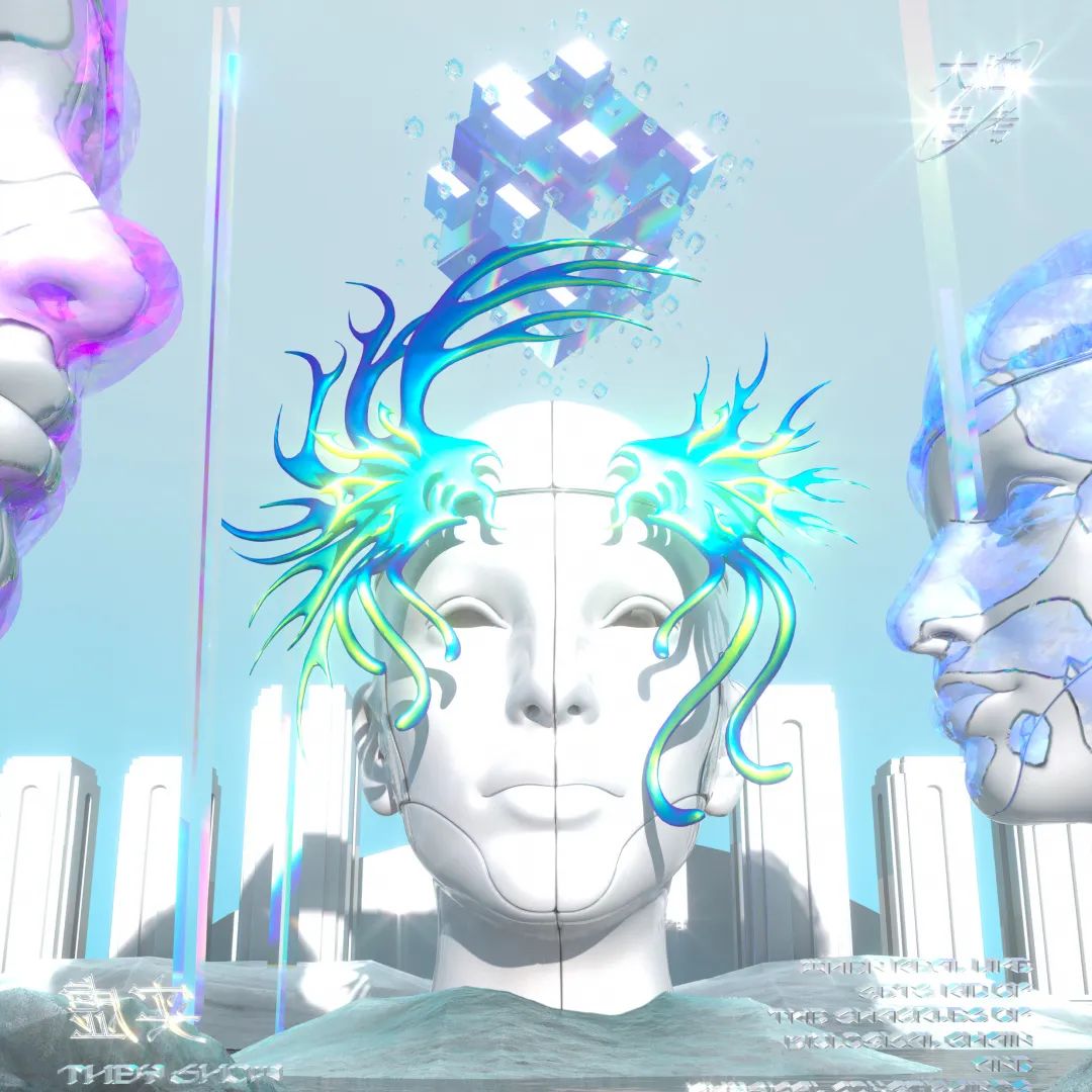自然、人类、智能,彼此之间作为创造与被创造的关系,他们不可分割不可替代,互相成就。在虚拟空间中思考虚拟的价值,它是否也能像现实中的生物那样灵动,人类创作的所有物该如何寄托人类的思想情感。造型参考大脑神经元树突状,置于大脑额叶两端,作为信息处理的连接。