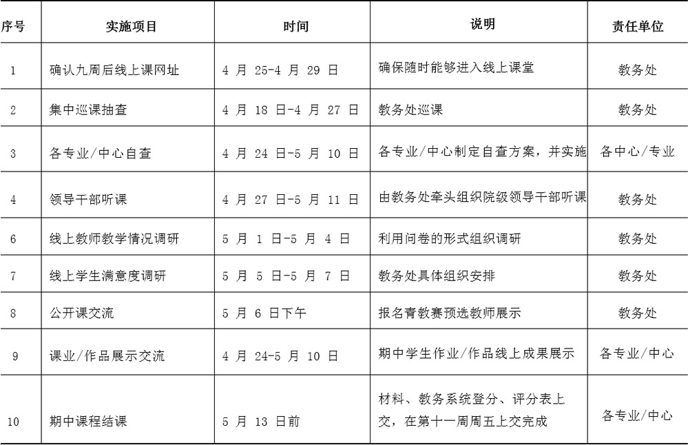 为了加强学院对教学运行过程的管理,维持正常的教学秩序,保证教学质量,学院决定从第八周(2021年4月18日)起,利用三周时间进行本学期线上期中教学检查,请各单位按以下安排组织实施: