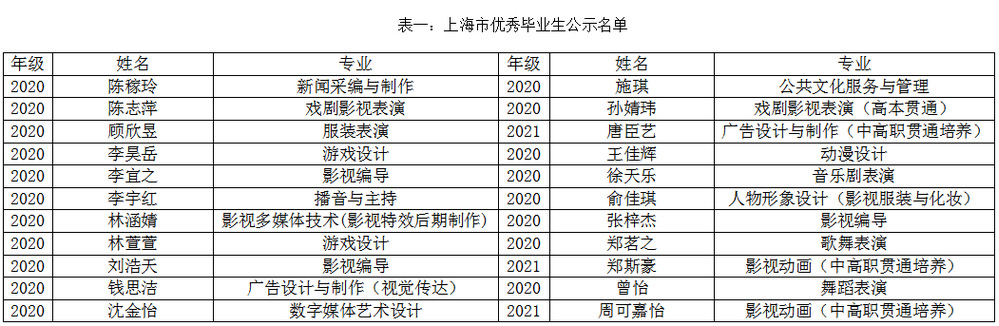 根据教委学生处《上海市教育委员会关于做好2023年度上海市普通高等学校优秀毕业生评选工作的通知》(沪教委学[2023]1号)精神,学院工作领导小组研究决定,组织2023届优秀毕业生评选工作,共评选出上海市优秀毕业生22人,上海电影艺术职业学院优秀毕业生43人。现将此次评选结果进行公示如下(排名不分先后,按姓氏拼音排序):