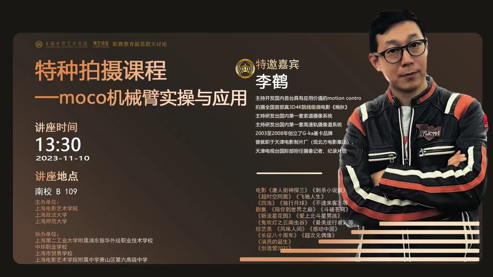 11月10日下午13:30,影视科创学院特邀创立特种拍摄G-ka基卡品牌创始人李鹤老师为大家带来讲座《特种拍摄课程—moco机械臂实操与应用》。李鹤老师曾主持开发国内首台具有应用价值的Motion Contrc,拍摄全国首部真3D4K院线级微电影《晚秋》,主持研发出国内第一套索道摄像系统与国内第一套高速轨道摄像系统,曾就职于天津电影制片厂(现北方电影集团)天津电视台国际部担任摄像记者。参与的项目有电影《唐人街神探三》《刺杀小说家》《超时空同居》《飞驰人生》《四海》《独行月球》《不速来客》等,剧集《陪你到世界之巅》《斗破苍穹》《新流星花园》《爱上北斗星男孩》《鬼吹灯之云南虫谷》《最美逆行者》等,综艺类《风味人间》《感动中国》《长征八十周年》《超次元偶像》《演员的诞生》《创造营2021》等。