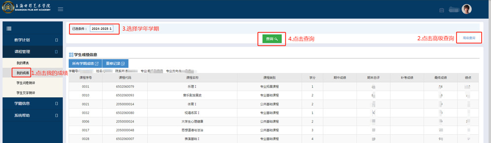 查询步骤:点击课程管理-点击我的成绩-点击高级查询-选择学年学期-点击查询