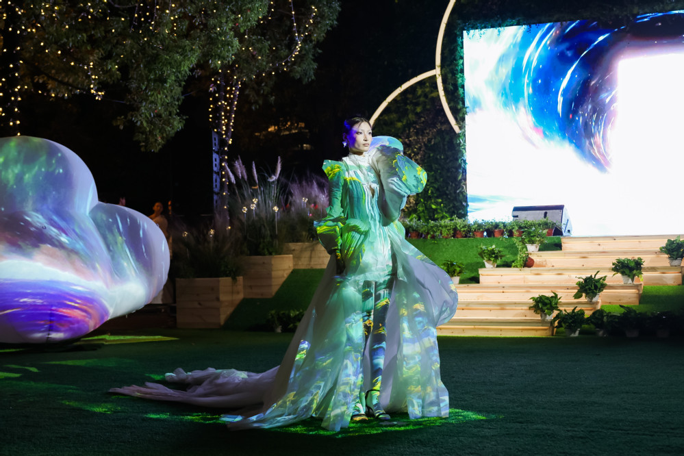 上海国际光影节是上海市政府批准创办的市级重大活动,致力于彰显上海城市精神、城市品格,展现城市更新成果、时尚之都魅力。传媒学院紧抓这一教学实践契机,以真实演出为课堂载体,围绕“服装×光影×科技”的创作命题,推动多专业协同创新。项目中,师生们打破多媒体图形设计、服装造型、T台表演与舞台灯光的边界,借助精准编程的动态光影实现实时投射,让光与布料在舞台上融为一体。模特身上的纯白服装成为光影流动的画布,科技的演绎赋予服装以灵动、变幻的视觉节奏,为上海市民带来一场跨越艺术与科技的沉浸式美学体验。