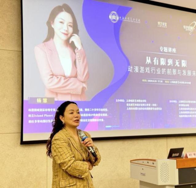 在数字化浪潮的推动下,动漫游戏行业正迎来新的发展机遇与挑战。2024年6月24日,上海电影艺术职业学院数字学院邀请动漫领域资深市场专家杨慧老师,举办《从有限到无限:动漫游戏行业的前景与未来发展》的专题讲座。杨慧老师,作为前卡游动漫高级副总裁,拥有超过二十年的行业经验。她创立的Island Planet (岛星+)在推动动漫游戏IP商业化赋能方面取得了显著成就,涵盖了IP衍生品开发、推广营销、快闪联名等多个领域。杨慧老师以其对动漫游戏二次元领域的深刻洞见和独特视角,担任多家动漫衍生品商业化首席顾问,为IP商业化提供了全链路解决方案,成效卓著。图1讲座现场在本次讲座中,杨慧老师深入分析了动漫游戏行业的当前市场状况,探讨了行业的痛点与挑战,并提出了创新的解决方案。她从IP的深度挖掘、跨界合作、技术融合等多个维度,为同学们描绘了一个充满无限可能的行业未来图景。杨老师特别强调了二次元文化在年轻群体中的影响力,以及如何利用这一文化趋势推动中国动漫游戏行业的发展。她分享了多个成功案例,包括如何通过IP联名、快闪活动等方式,提升动漫游戏IP的市场价值和消费者的情感连接。图2 讲座现场讲座的最后,杨慧老