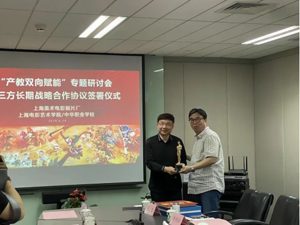 2020年6月24日下午,上海美术电影制片厂、上海电影艺术职业学院、中华职业学校“产教双向赋能”专题研讨会暨三方长期战略合作洽谈会在上海美术电影制片厂会议室内举行,美影厂王华强副厂长、上海电影艺术职业学院江泊院长、是科圣副院长、中华职业学校黄芸副校长等领导出席。上电数字娱乐中心主任包文君、演艺中心主任曲慧佳、视觉艺术中心主任顾平、影视制作中心主任许文君和专业负责人、教师代表等一起参加此次会议。