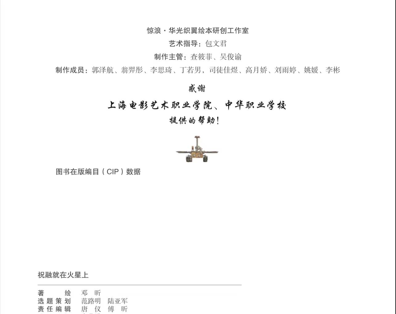 《我的中国航天课》作为出版社年度重点出版物,在品质要求上很高,作为科学系列绘本,在创作前期,需要师生投入大量精力学习关于航天的基本知识,了解并收集大量与航天有关的信息和素材,确保绘本绘制的准确性。为此,在作者惊浪传媒总经理邓昕老师的指导下,项目组在绘制前期召开了多次研讨会,一起学习航天知识并确定素材的准确性。项目组利用线上教学管理模式打通技术管线,在疫情期也确保项目有序进行。打开每一本散发油墨香气的新绘本,在封二版权页都醒目地写着:上海电影艺术职业学院、中华职业学校、惊浪·华光织翼绘本研创工作室,以及十多位师生的名字。