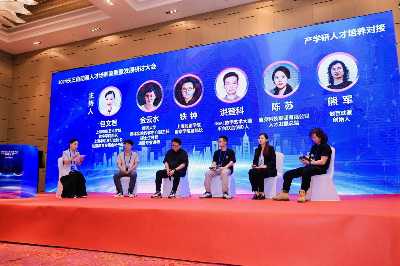 在圆桌讨论《产学研人才培养对接》环节,包文君院长作为圆桌主持人与院校代表和企业共同探讨在AIGC为代表的新质生产力飞速发展背景下,如何培养优质动漫人才,并提出了建议。