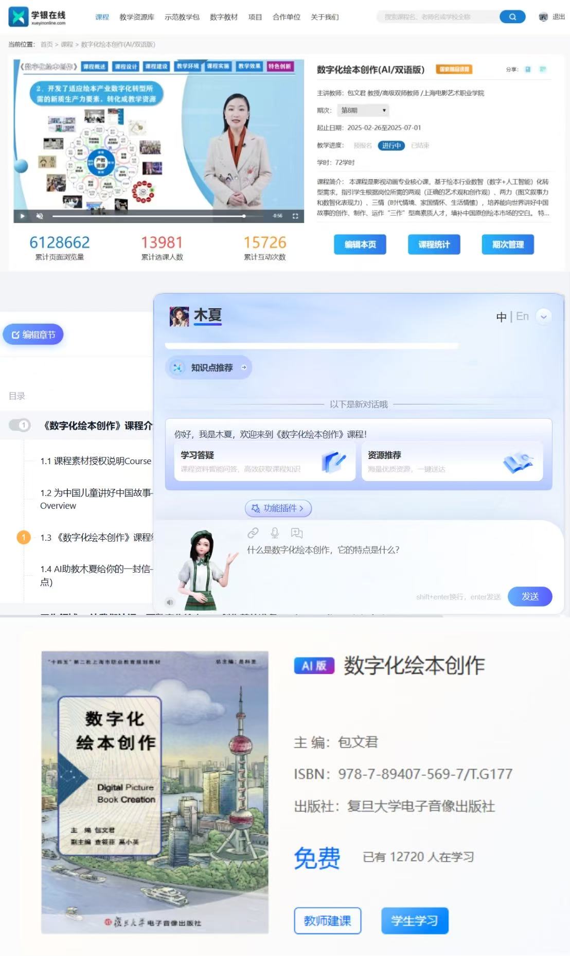 《数字化绘本创作》课程作为影视动画和动漫设计专业的核心课程是一门线上线下相结合的智慧课程,依托国家在线精品课程和“十四五”上海市职业教育规划教材,在学银在线平台上开展混合模式教学,充分利用知识图谱和AI助教功能实现精准化学习路径规划,为每一个学生提供了个性化的学习空间。“今年下半年,我们将依托AIGC联合研创工作室,将学生们原创的优秀绘本孵化出版,并利用AI和沉浸式体验技术,让绘本动起来,并把它们推向市场,为中国的孩子们营造全新虚实结合的阅读空间,同时也以此检阅课程产教一体化的 落地情况!让大家都能看到职业教育创制一体化人才培养的成果!”课程授课教师、数字学院院长包文君说。