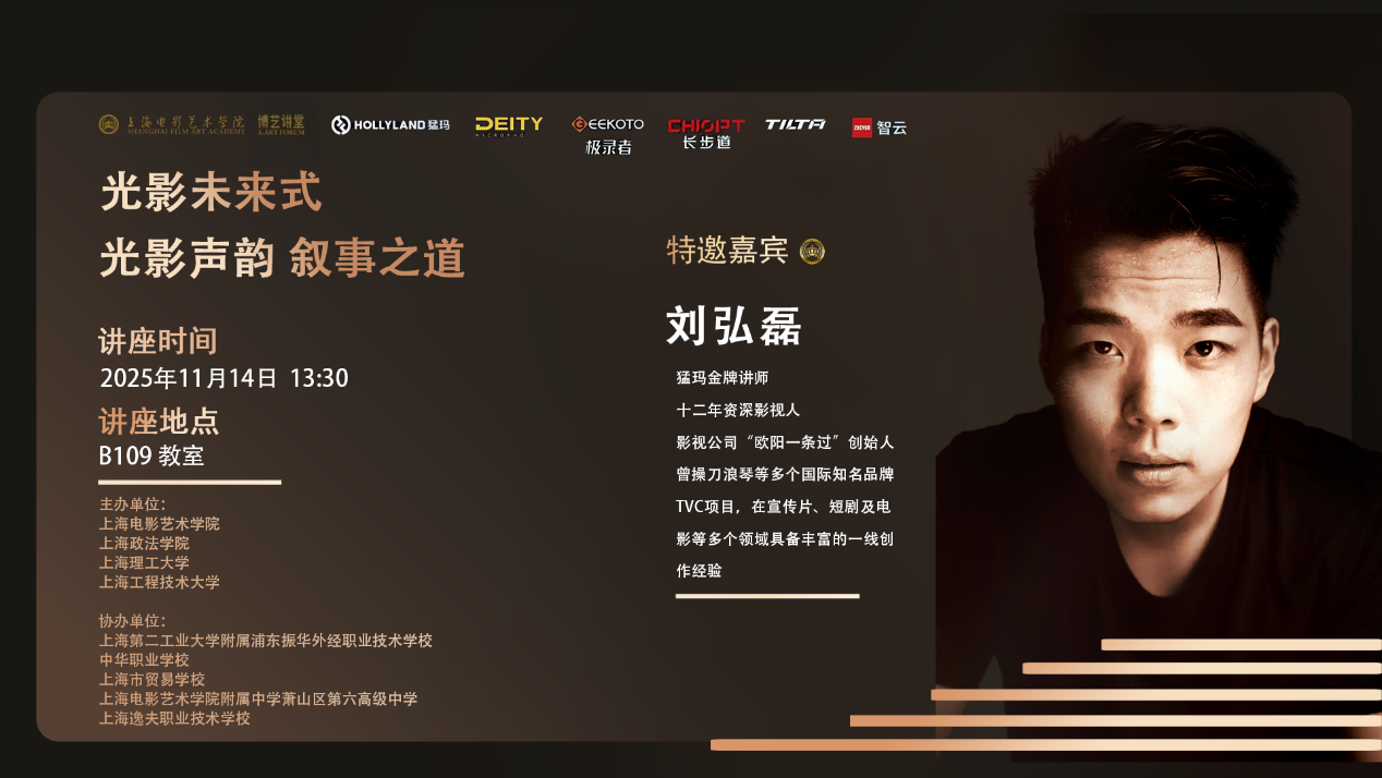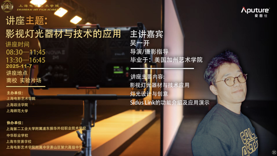 为深入贯彻《国家职业教育改革实施方案》中“深化产教融合、校企合作”的核心要求,落实国家广电总局“网络视听产教融合人才培养专项”关于“培育技术过硬、实战能力强的影视人才”的建设目标,2025年11月7日,影视科创学院“爱图仕工作坊”在实验片场如期举行。以“理论精研+设备实操+场景创作”的三维模式,实现教学与产业需求的精准对接,是专业践行“艺科融合、产教协同”育人理念的又一重要实践。作为影视制作核心模块,影视照明实训始终以行业前沿技术为导向,聚焦职业岗位核心能力培养。本次合作的爱图仕(Aputure)作为全球影视照明领域的领军企业,其技术成果与行业标准为实训提供了优质资源支撑。实训前,专业教师团队与爱图仕技术专家深度研讨,结合学院的人才培养优势,量身定制了涵盖“光影理论进阶、设备性能解析、场景布光实战、作品复盘优化”的全流程课程体系,既强化基础理论认知,又突出职业技能落地。图1第四期爱图仕讲座海报本次主讲嘉宾吴一开(Luc),CalArts电影导演硕士,专长胶片摄影,作品曾入围柏林、北京等国际电影节。其中吴一开老师深耕影视照明教学与行业实践十余年,曾参与《外滩钟声》《三十而已》等多部影视作