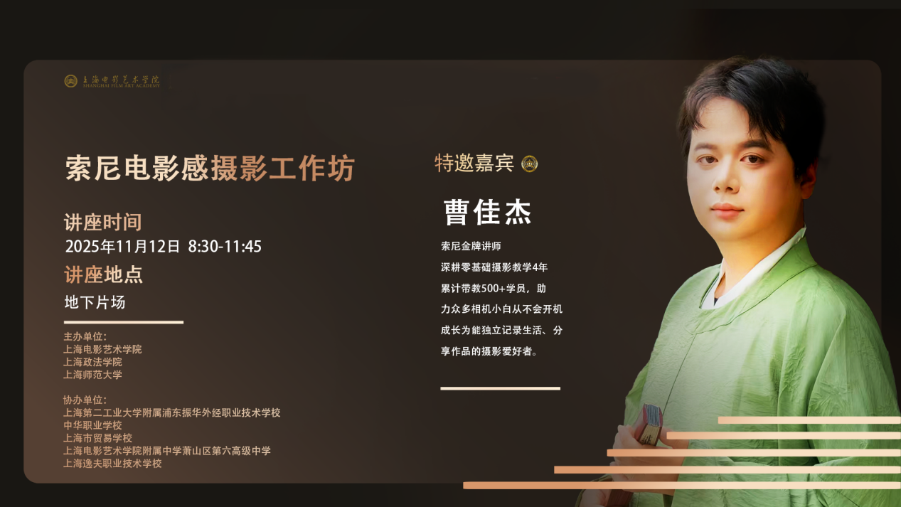 为贯彻国家职业教育改革精神,落实高职教育“产教融合、校企协同”育人核心要求。2025年11月12日,上海电影艺术学院摄影摄像技术专业特邀索尼(中国)金牌讲师曹佳杰到校,开展“索尼电影感摄影工作坊”专题教学。作为学院“引企入教”关键实践,活动紧扣高职影像人才培养定位,将行业前沿技术、设备规范与创作理念融入教学,为2025级学子搭建课堂与产业无缝对接的实践平台,助力夯实专业技能、提升职业适配度,为高职影像专业育人模式创新提供实践支撑。本次工作坊聚焦人像摄影与视频拍摄两大核心领域,曹佳杰老师从实战角度出发,通过设备实操、案例分析和现场拍摄等多元化教学方式,全面展示了索尼相机系统在专业影像创作中的技术优势。图1索尼电影感摄影工作坊 曹佳杰老师理论实践深度融合,解锁人像摄影新思路工作坊上,曹佳杰老师从实战角度出发,将人像摄影系统解构为多个专业题材类别,系统讲解了人像摄影的核心技法,并为每个类别量身定制了完整的拍摄方案。这种分类教学的方法,让刚刚接触专业摄影的学子们能够快速建立清晰的学习框架。针对环境人像创作,曹老师提出了场景-人物-情感的三位一体法则。强调环境人像不是简单的背景虚化,而是要让人物