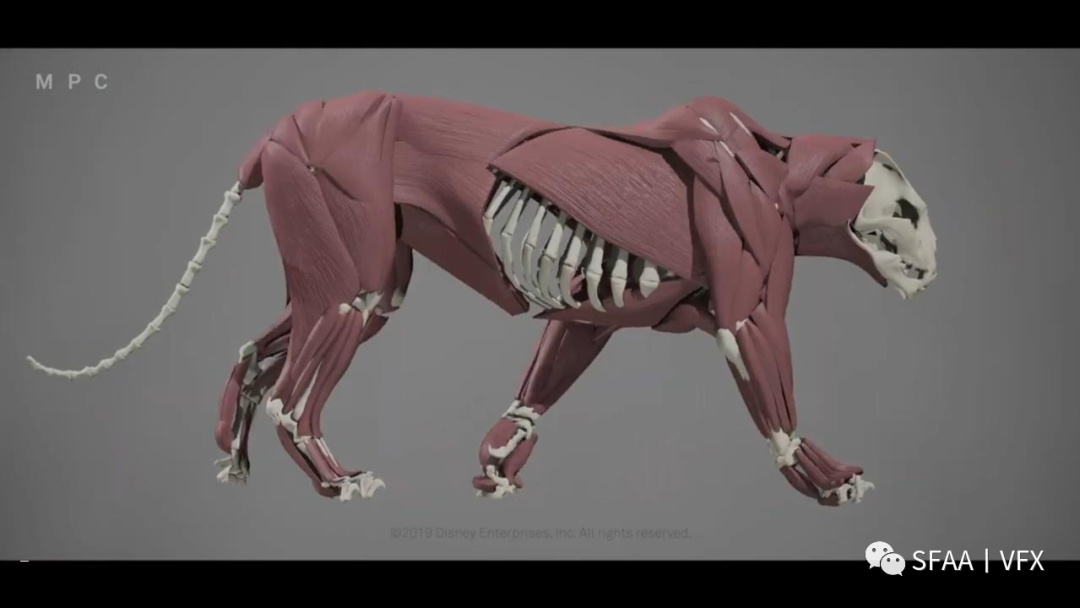 而在电影《狮子王》(2019)中刀疤的角色动画开发,动物角色的运动的需要绑定来实现,即在动画建模中加入的运动控制器进行动作设计,要在骨骼的基础上加入肌肉结构、皮肤的纹理、拉伸效果和其他的外貌特征,需要制作者对于动物的理解达到解剖级别才能最终达到真实的效果。
