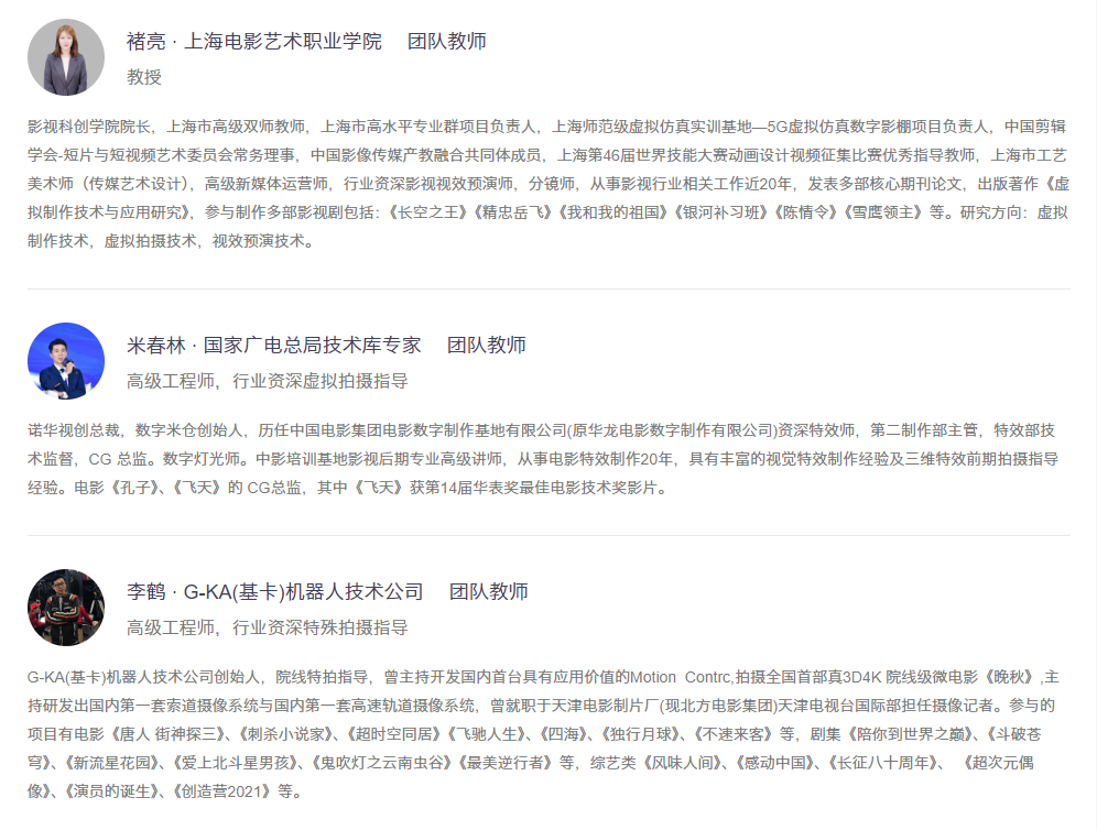 本课程构建“双师”型教学团队,深度融合行业资源与教学经验,为人才培养提供强力支撑。课程负责人由摄影摄像技术专业主任苏锴担任,团队由7名校内双师型教师(含教授1人、副教授1人、上海市高级“双师”5人)与3名行业特聘导师(含广电总局技术库专家 1人、院线电影特拍指导1人、华东地区无人机裁判1人)组成,成员深度参与《唐人街探案》、《志愿军》、《云霄之上》等几十余部影视作品制作。