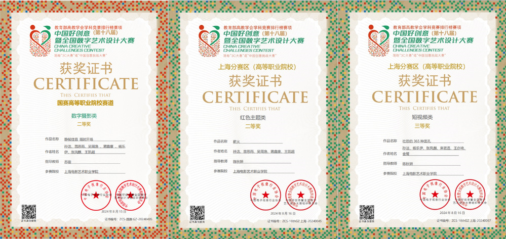 22级摄影摄像高本班的孙洁同学以现象级表现脱颖而出,秉持“技术+艺术”双核驱动的复合型学习实践:孙洁同学斩获第十八届中国好创意全国数字艺术设计大赛国家级二等奖,另外省部级二、三等奖也同步收入囊中。在2024上海民办高校短视频大赛实现“一等奖+二等奖+三等奖”全满贯,同时获评2023上海大学生红色景点创作大赛优胜奖。