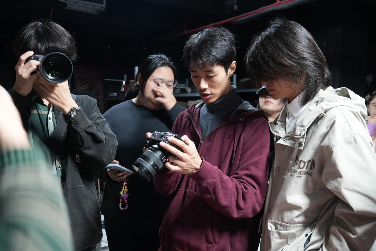 工作坊特别设置了器材体验环节,索尼影像带来了旗下各类不同型号的相机、镜头,从全画幅微单A7M4到电影摄影机FX3,从G大师定焦镜头到半画幅电动变焦电影头,同学们轮番上手操作,亲身感受不同设备的表现特性。曹老师重点演示了索尼相机的人眼追踪技术,当取景框中的人眼被牢牢锁定那一刻,同学们不禁发出阵阵惊叹。