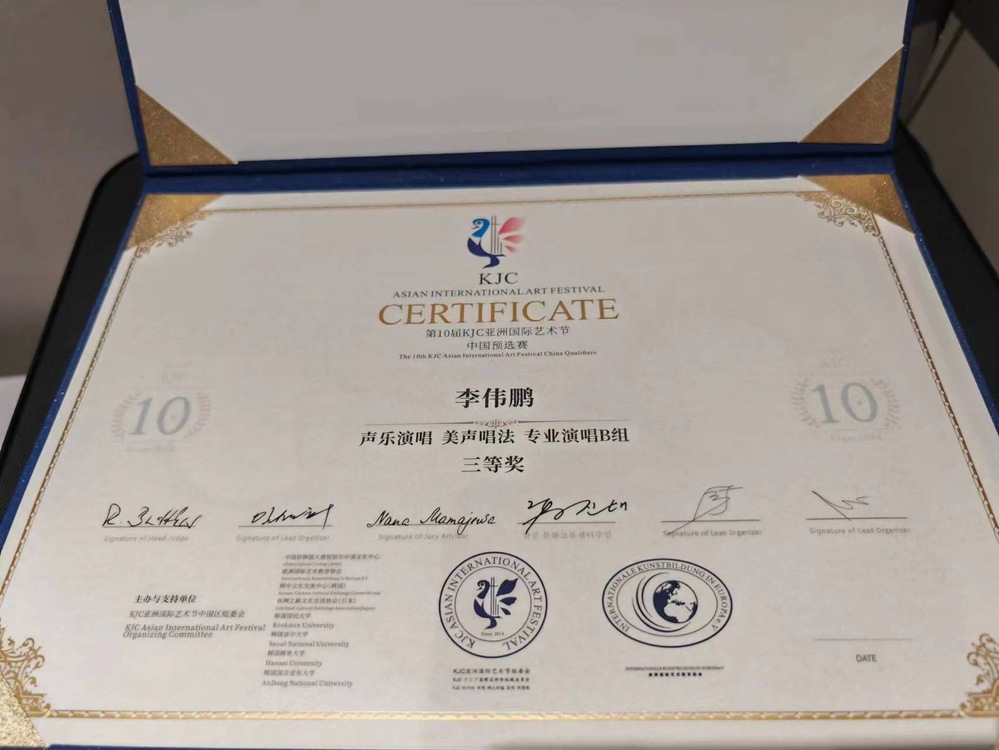 参赛同学们说通过这次比赛见识到了不一样的大舞台以及拓宽了自己的视野。李伟鹏同学表示本场比赛收获很大,有奖项上的收获,也有技术表达上的收获。不过更重要的是,他觉得作为中国人有义务、有责任,将中华五千年的悠久历史所蕴含的诗乐文化以更好的姿态,展现在世界大众的眼前。对此,任重而道远。他的参赛曲目是《越人歌》,《越人歌》是一首古词新曲的楚辞作品,讲述的是民族、身份、地位,均不相同的民族之间跨越阶级的爱情故事。本场比赛的服装,也是尽可能的还原中国古代文人的服装特点,以最大程度地还原《越人歌》所蕴含的故事。他提到,中国艺术歌曲有一种自然流淌在我们血液里的情感,这是只属于东方特有的美感,作为中国人在呈现中国艺术歌曲的时候需要通过自己对于中国文化的理解,传形达意地将其背后所蕴含的文化和色彩表达出来。