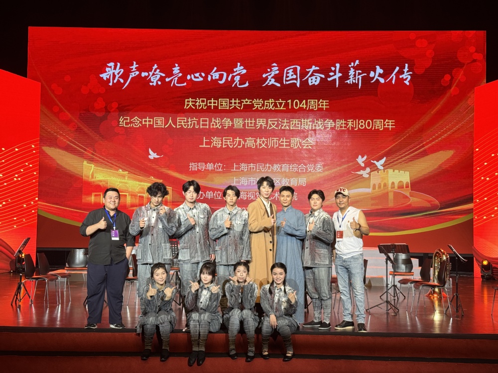 为庆祝中国共产党成立104周年、纪念中国人民抗日战争暨世界反法西斯战争胜利80周年,6月18日,“歌声嘹亮心向党 爱国奋斗薪火传”上海民办高校师生歌会在上海举行。表演学院音乐剧专业师生受邀参演,携原创作品《<国之当歌>青春版》深情献唱,以青春之声致敬信仰之光。