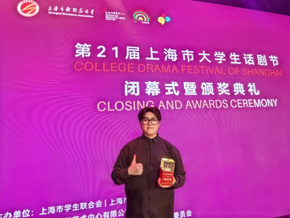在第二十一届上海市大学生话剧节上,学校表演学院师生倾力打造的原创音乐剧《向阳而生》作为开幕剧目在上海话剧艺术中心隆重上演,上海电影艺术职业学院获得“优秀团队奖”,刘书彤(饰演袁春晖)获得“优秀个人表演奖”,主演徐泽阳(饰演聂耳)凭借出色表现,一举摘获本届话剧节“最佳男主角奖”。该剧整体以精湛的艺术呈现、深刻的人文内涵和饱满的情感张力,赢得专家评委高度赞誉,为学院表演专业教学成果再添璀璨一笔。表演学院徐泽阳、郭旭禾、周泓旭作为学生代表,于6月18日晚参与闭幕式暨颁奖典礼。