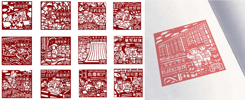 广告艺术设计专业将图案设计、产品设计、字体设计与编排、海报设计综合能力与该实训项目融合,并把课程思政内容融会贯通,在校馆合作过程中,开展“育人”课程。让参与这个项目的同学深刻了解并学习了“八百壮士”坚持抗战、绝不屈服的精神。旗面图案是根据四行仓库里面的展馆和重点内容进行制作,主要表现了战士们在当时环境下的状况和他们奋勇杀敌,不屈不挠的精神。整体以四行仓库的参观线路进行思考,棋盘内设计的动作走向表现了当时在四行仓库内的战士们坚守阵地,奋勇杀敌的真实状态。有的战士在投掷手榴弹;有的战士在射击敌人;还有谢晋元将军带着士兵们手写遗书。通过游戏过程,我们可以获取到一个非常完整的四行保卫战的故事。整个棋盘色彩鲜亮,构图饱满,士兵形象生动可爱,脸部表情正义勇敢,年轻化的设计风格可以吸引更多的青年学生来关注和了解四行保卫战,了解爱国主义精神。