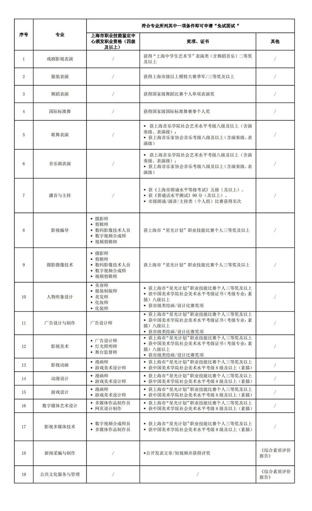 学生按要求在规定时间申请“免笔试面试”,并提交材料。我院各专业的免笔试面试条件如下表,考生经材料审核且免笔试面试通过后,可获得免笔试资格。考生第一志愿填报该专业时,免笔试资格方可生效。获得免笔试资格的学生: 免专业校考及文化笔试,视为拟录取。各专业获得免试资格的人数,不超过该专业各类(I、II、III、IV类)计划总量的50%。